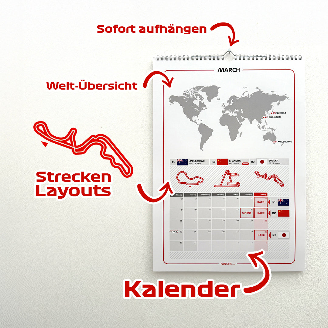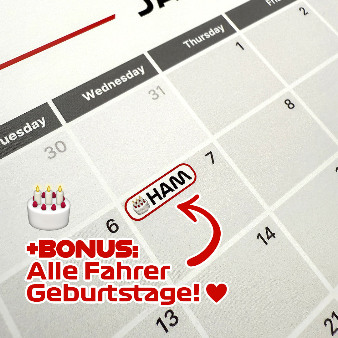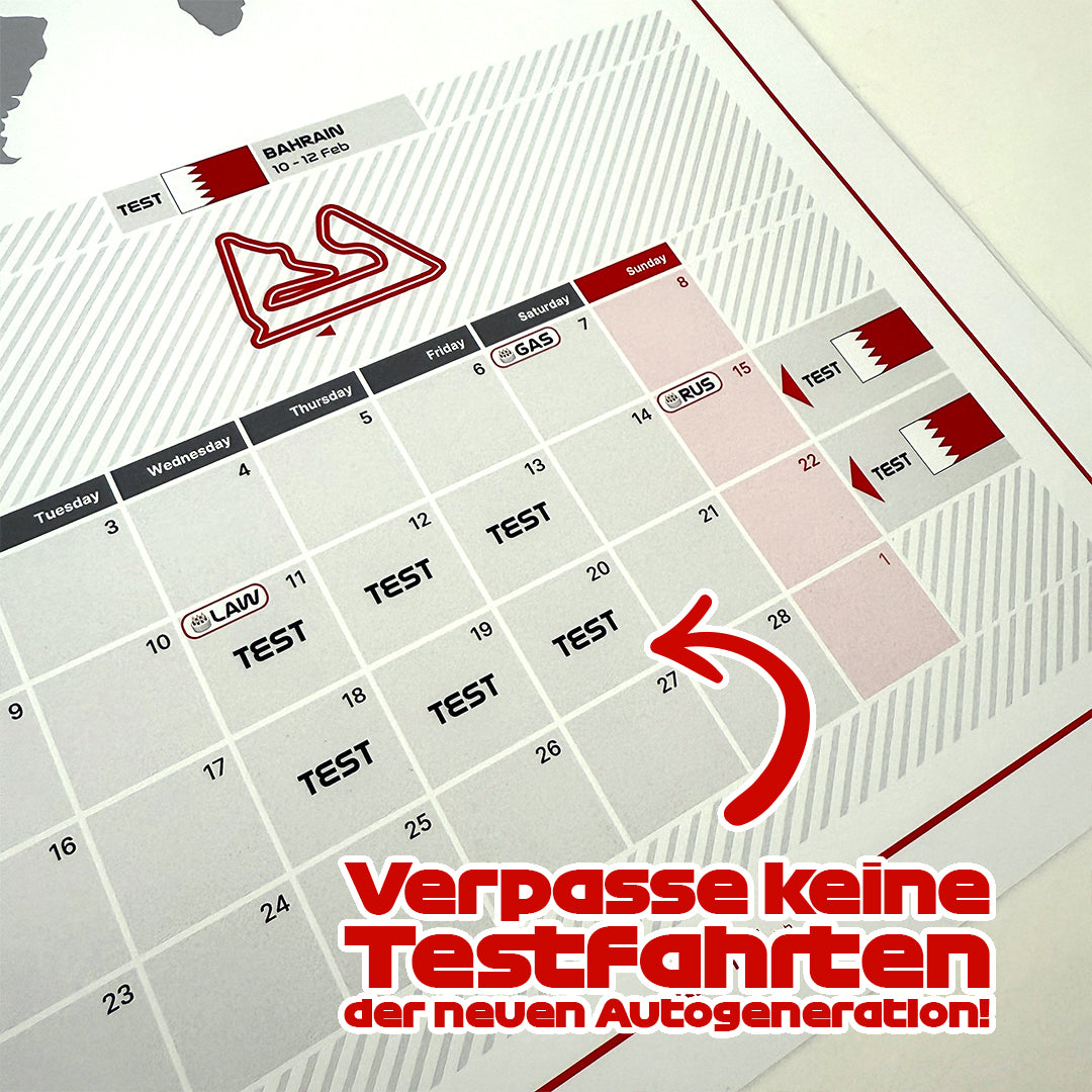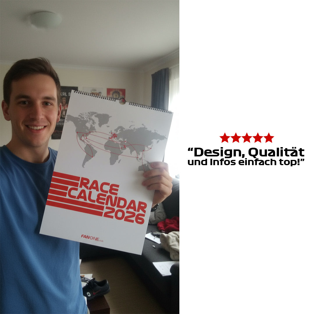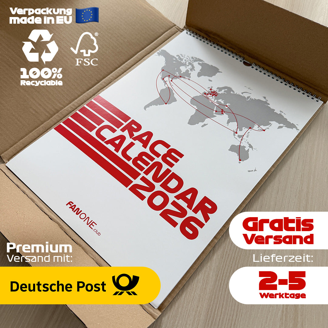 Der Rennkalender 2026 (A3) bietet einen Überblick über die gesamte Saison – mit allen Rennen, Terminen und detaillierten Darstellungen aller Rennstrecken. Außerdem enthält er die Geburtstage aller Fahrer, sodass Sie keinen besonderen Tag verpassen. Stilvoll, übersichtlich und praktisch – das perfekte Geschenk für Freunde, Familie oder Kollegen, die die Formel 1 lieben. Ein Muss für alle, die den schnellsten Sport der Welt verfolgen möchten.